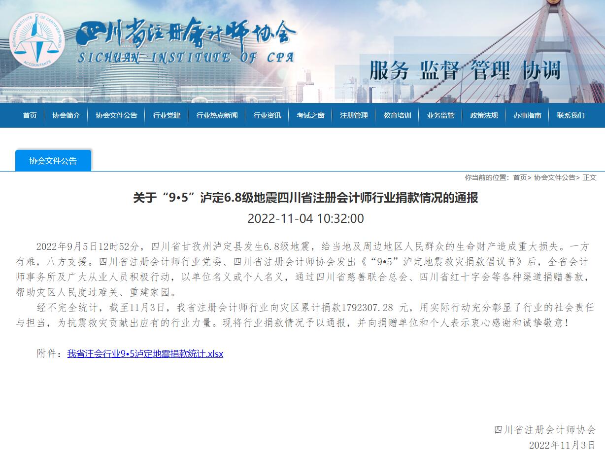 我所在“9·5”泸定6.8级地震四川省注册会计师行业捐款情况通报