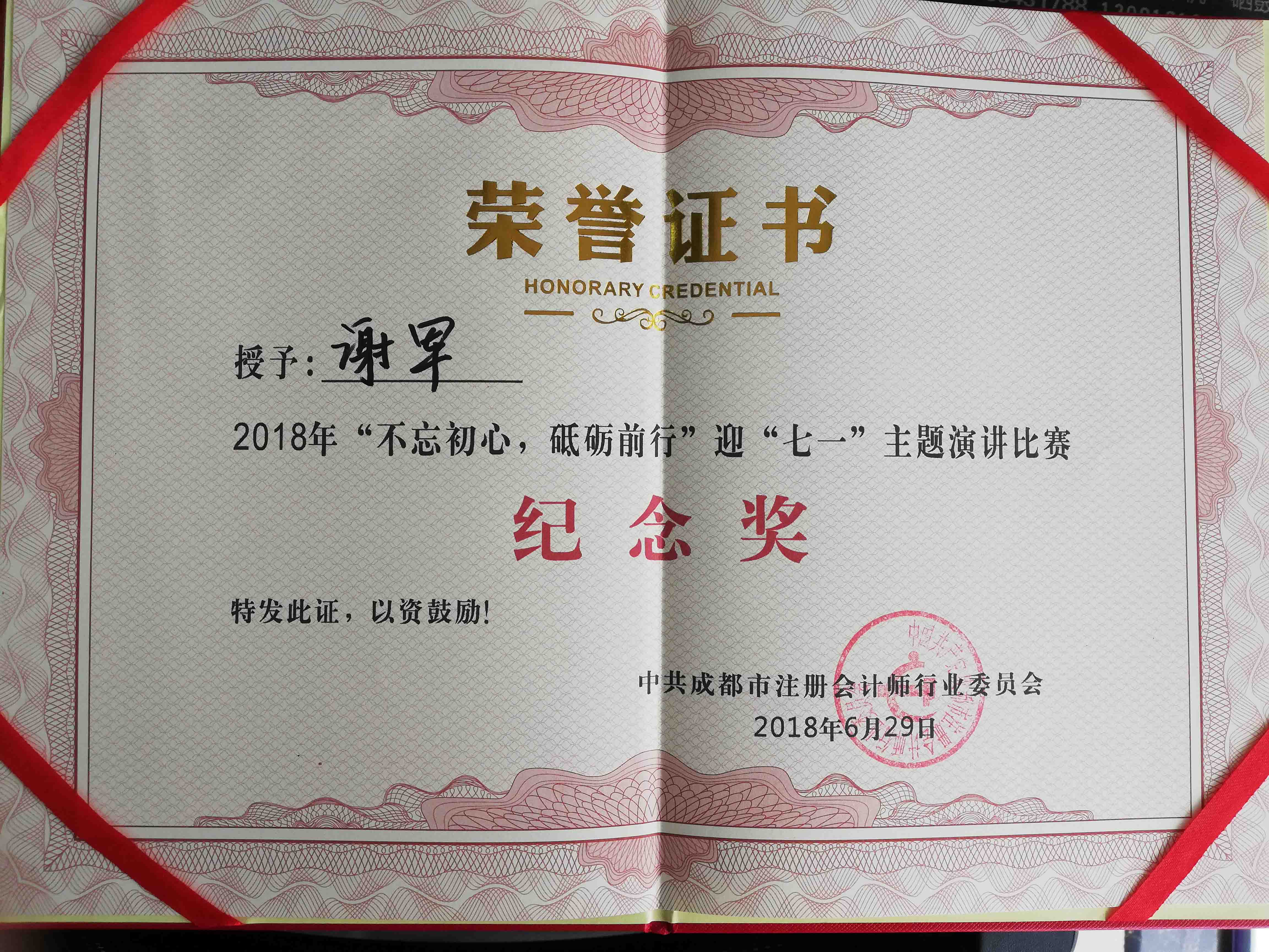 2018年6月29日,我公司参加中共成都市注册会计师行业委员会举办的“不忘初心 砥砺前行”迎“七一”主题演讲比赛