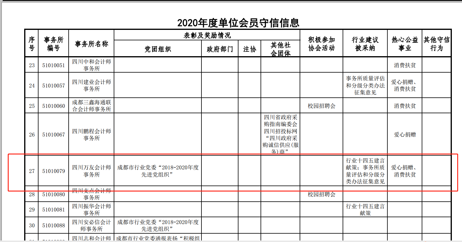 2021年3月,四川万友会计师事务所有限公司及我所法人代表被列入四川省注协2020年度诚信档案