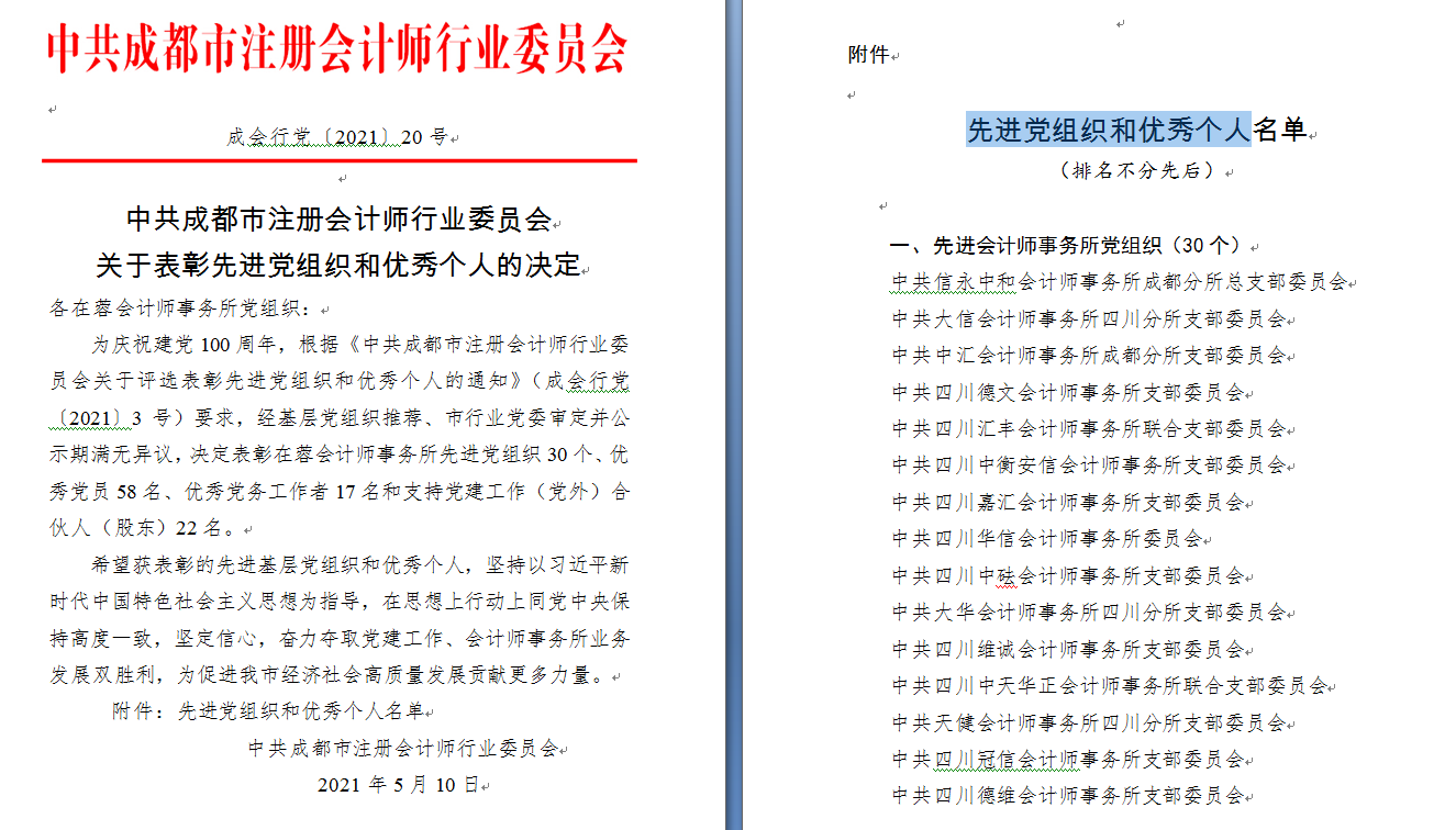 2021年5月10日,中共四川万友会计师事务所支部委员会及共产党员张杰被中共成都市注册会计师行业委员会评为先进党组织和优秀个人