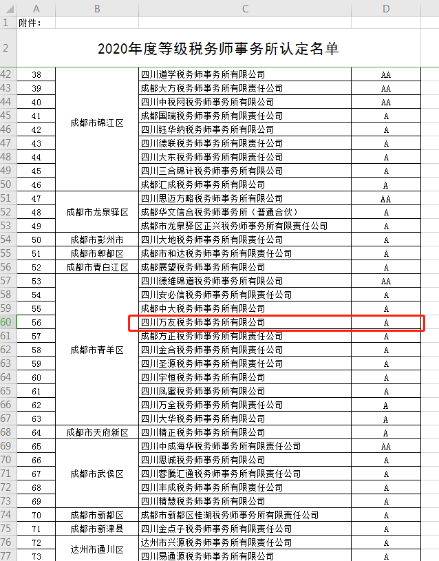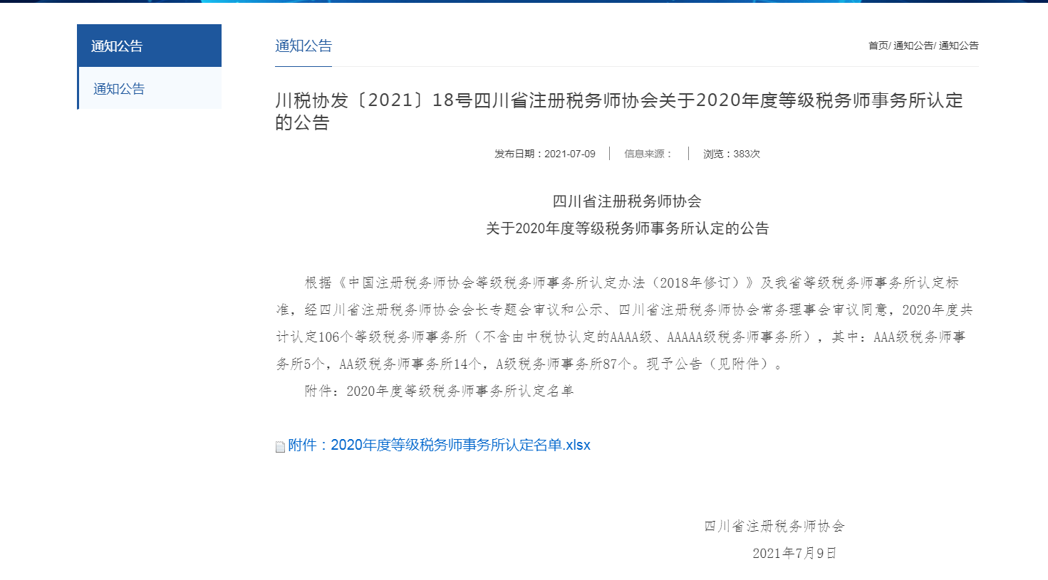 2021年7月9日,四川万友税务师事务所有限公司被认定为2020年度登记税务师事务所A级事务所