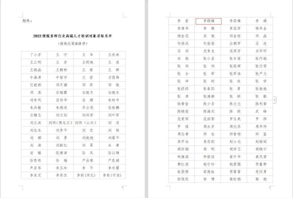 2022级中国注册税务师行业高端人才培训录取名单,我所李晓梅上榜