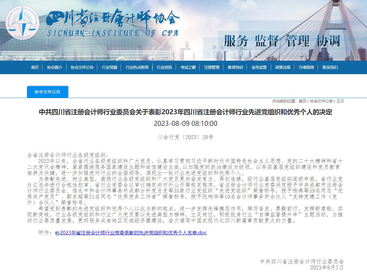 上一篇: 2023年我所在四川省注册会计师协会发布四川省2023年会计师事务所综合评价百家排名信息的通告中位列第45名