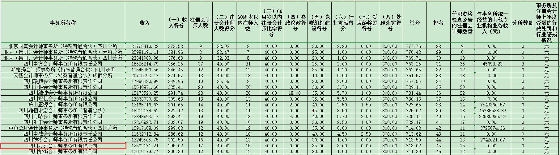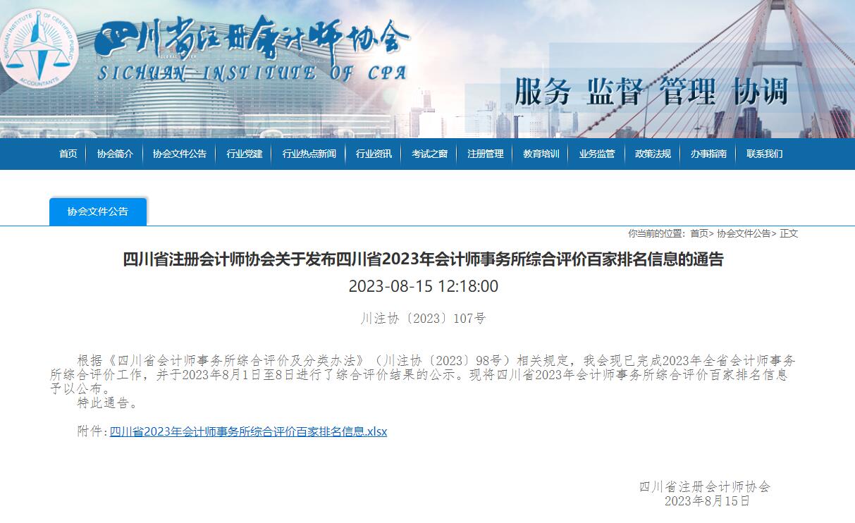 2023年我所在四川省注册会计师协会发布四川省2023年会计师事务所综合评价百家排名信息的通告中位列第45名
