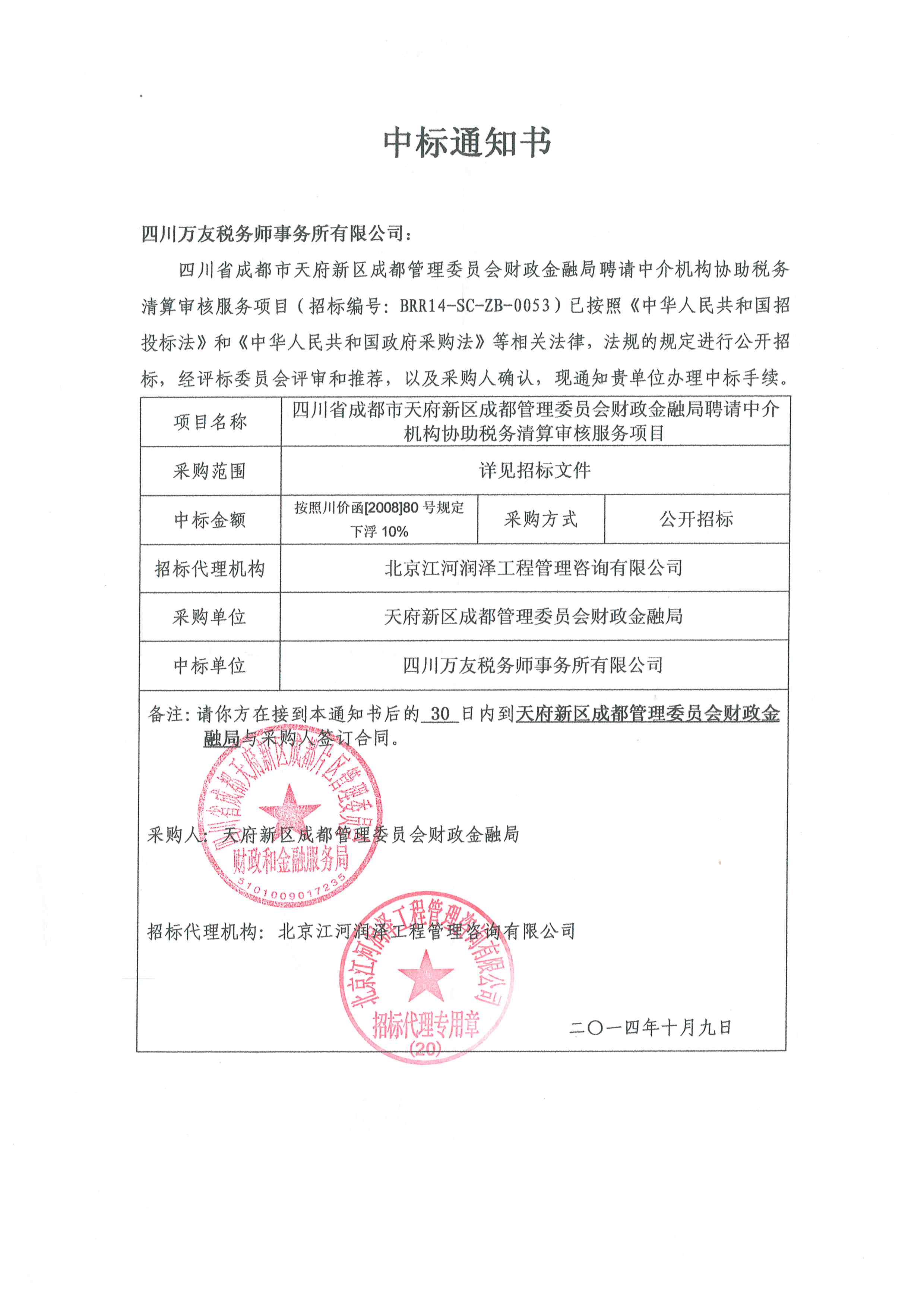 2014年10月,四川万友税务师事务所入围天府新区成都管理委员会财政金融局税务清算审核服务中介机构名单
