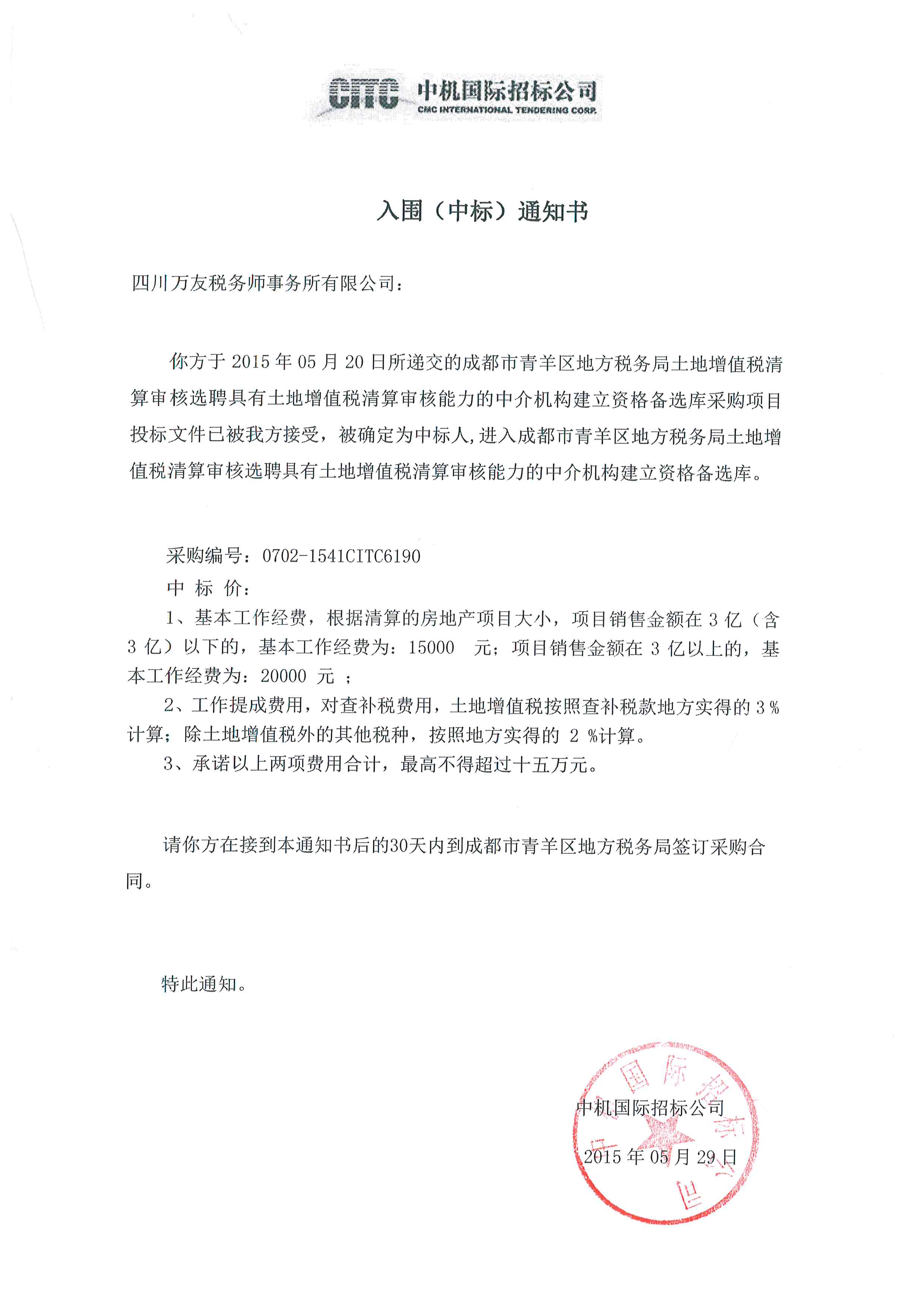 2015年5月29日,四川万友税务师事务所成功入围四川省成都市青羊区地方税务局土地增值税清算审核资格备选库