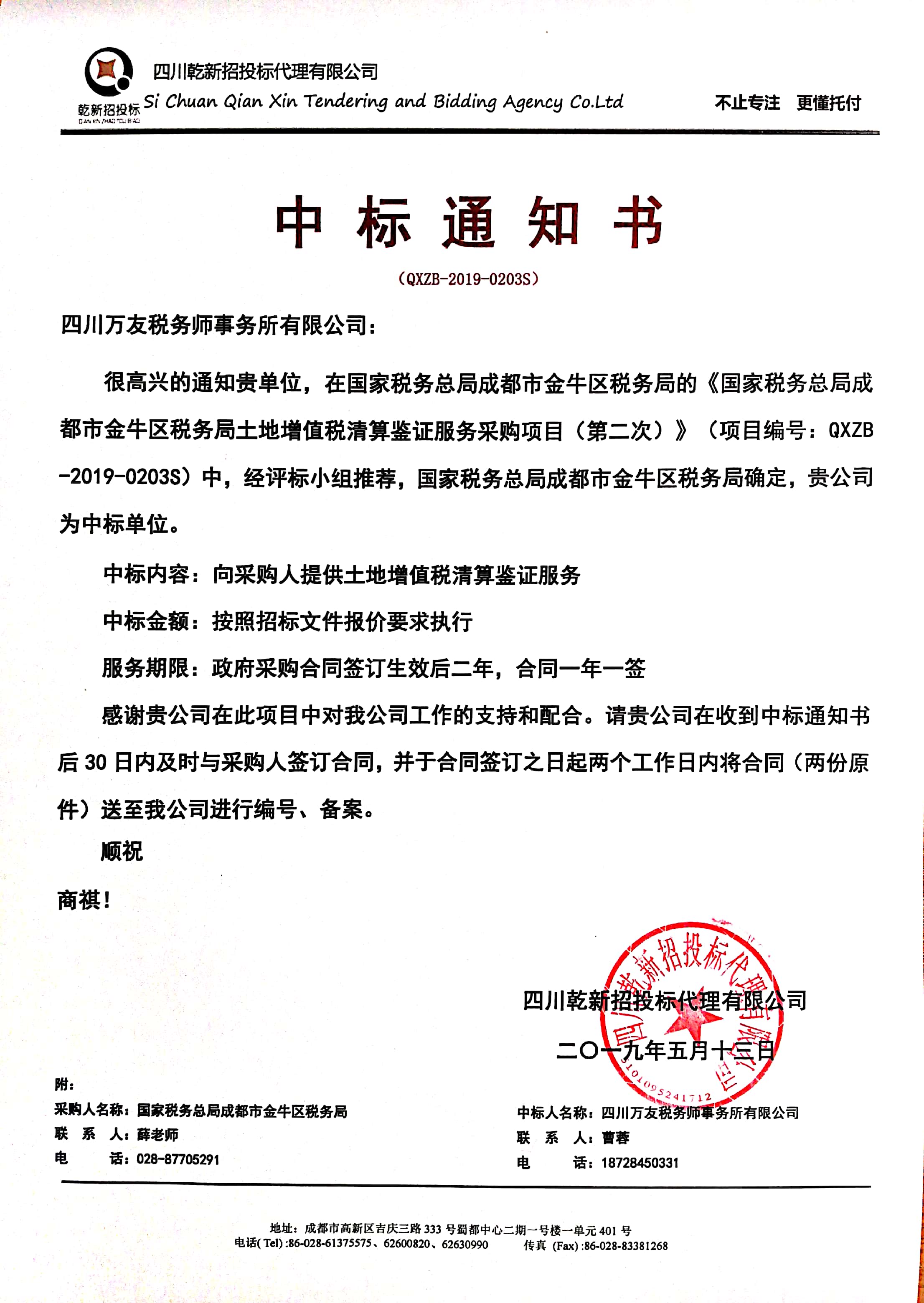 2019年5月13日,四川万友税务师事务所中标国家税务总局金牛区税务局的土地增值税清算鉴证项目