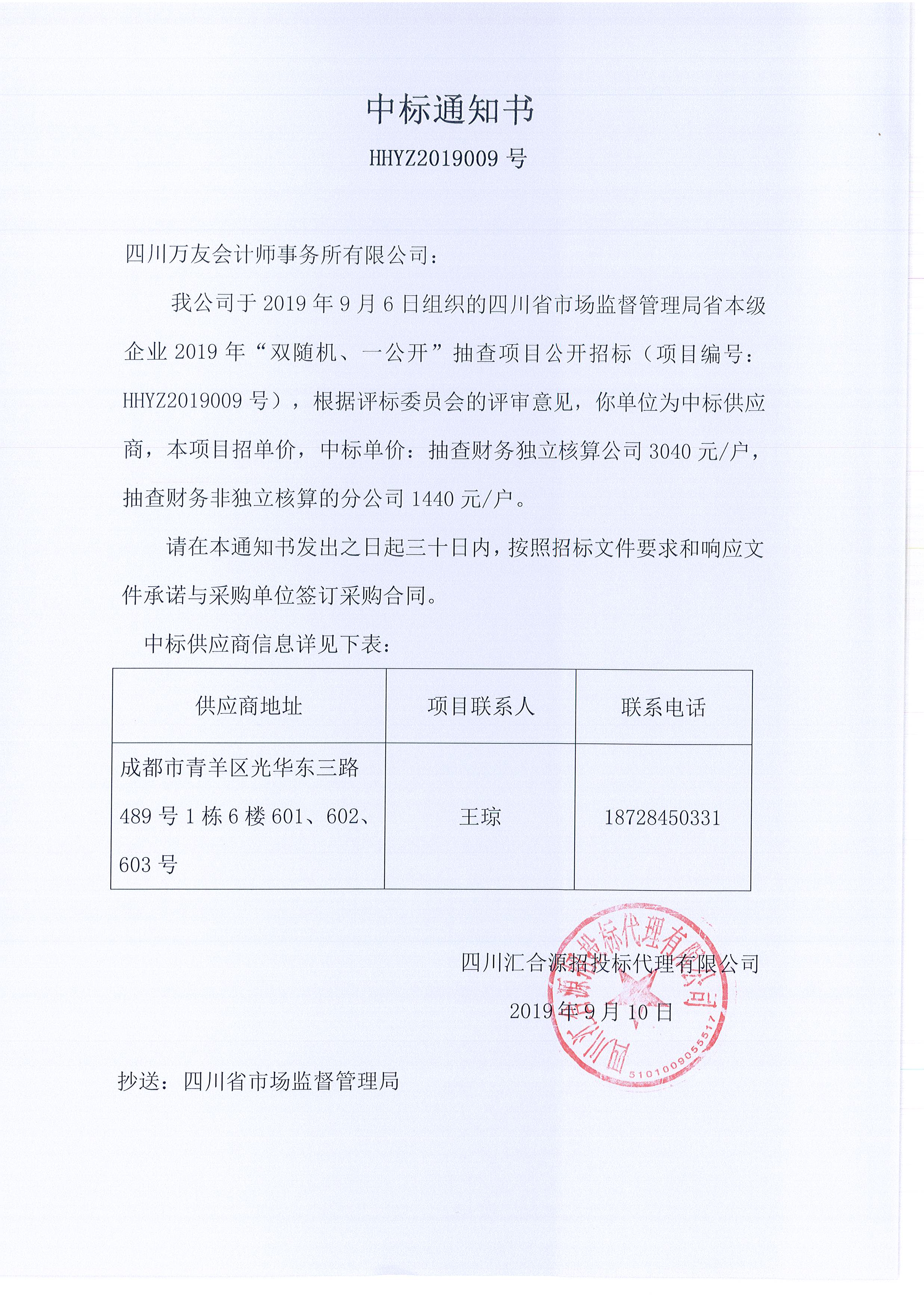 2019年9月10日,四川万友会计师事务所中标四川省市场监督管理局省本级企业2019年“双随机、一公开”抽查项目