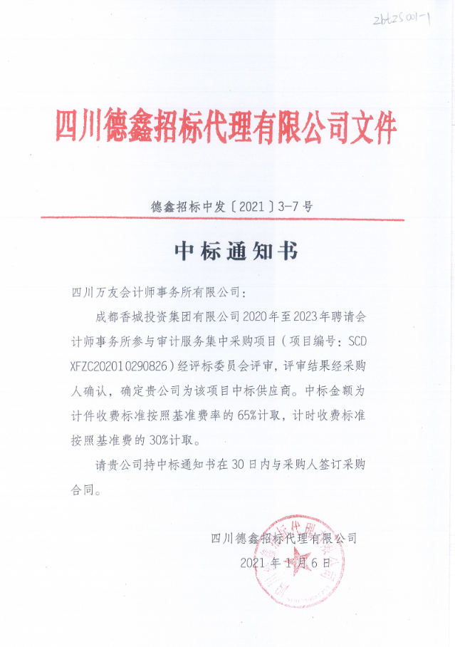 2021年1月,我公司中标成都香城投资集团有限公司2020年至2023年聘请会计师事务所参与审计服务集中采购项目(项目编号:SCDXFZC202010290826)