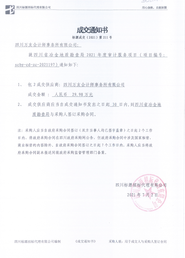 2021年7月,我公司中选四川省冶金地质勘查局2021年度审计服务项目