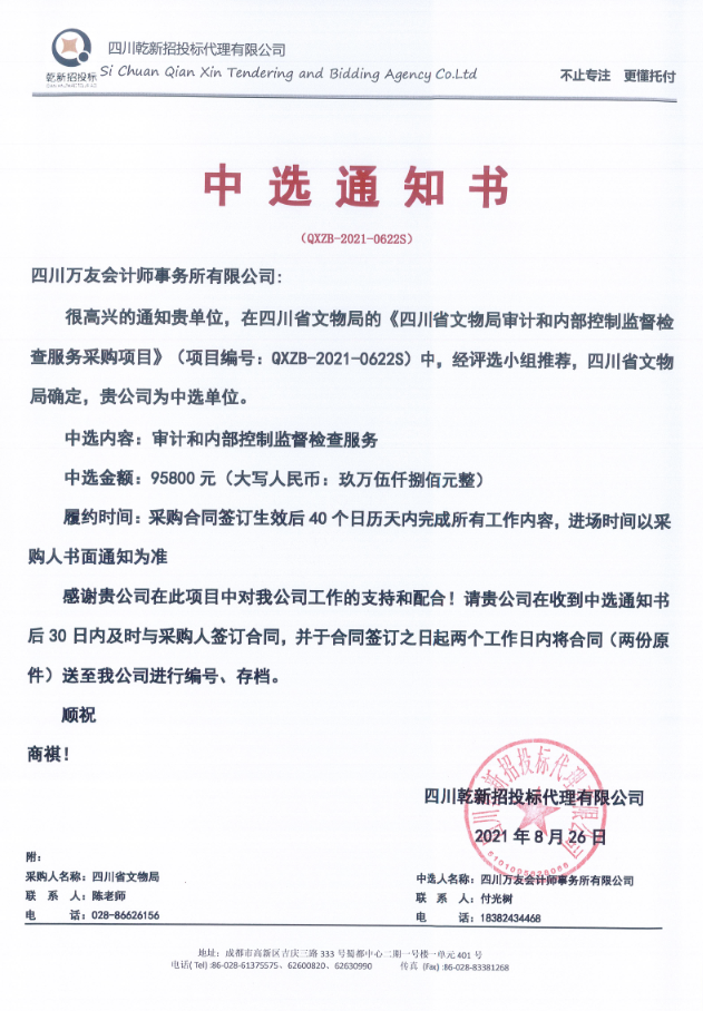 2021年8月,我公司中选四川省文物局的《四川省文物局审计和内部控制监督检查服务采购项目》