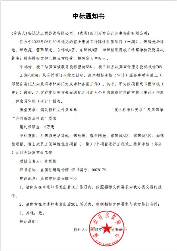 2022年6月,我公司入选成都市住房保障中心竣工结算及财务决算审计服务采购项目