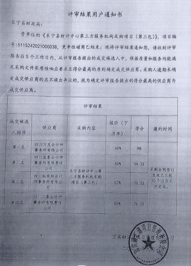 2021年9月,我公司入选长宁县财评中心第三方服务机构采购项目(第三包)