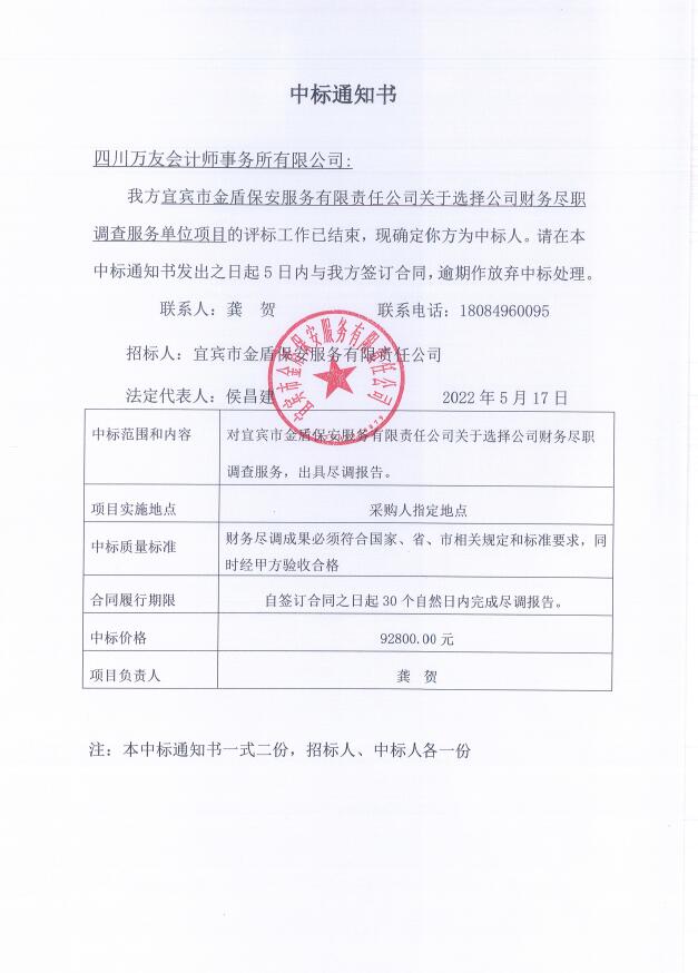 2022年5月,我公司入选宜宾市金盾保安服务责任公司关于选择公司财务尽职调查服务项目